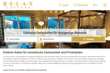 Die Buchungsplattform relax-cottage.com vermittelt exklusiv ausgestattete Feriensuiten und Ferienhäuser. Die Website präsentiert die Unterkünfte in ansprechender Form in vier Sprachen. Der Nutzer kann die Verfügbarkeit der Unterkunft im Wunschzeitraum direkt prüfen und eine Buchung über die Plattform ausführen.