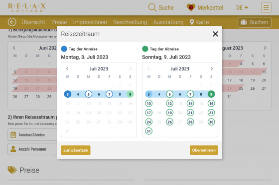 Dies betrifft sowohl die detaillierte Suchfunktion, als auch die Darstellung der Dreimonats-Kalenderübersicht in der Detaildarstellung einer Unterkunft. Final findet auch nochmals eine lokale Verfügbarkeitsprüfung innerhalb der Detailseite statt, von der aus bei Erfolg sofort eine Buchung ausgelöst werden kann.