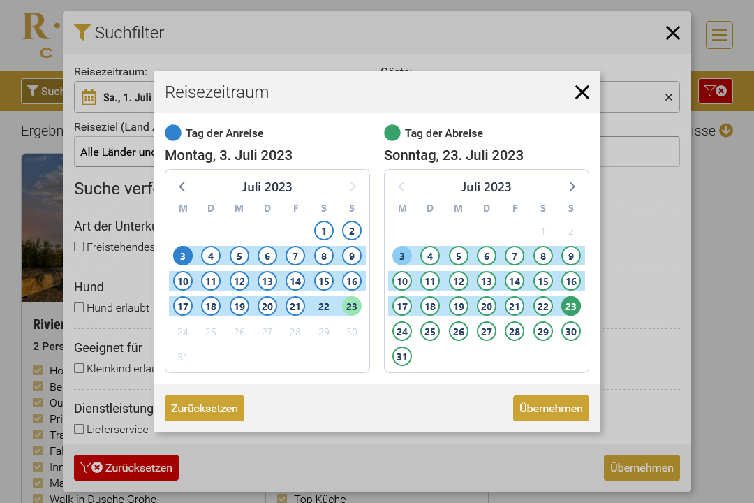 Das betrifft sowohl die Seiteninhalte selbst (Stammdaten der Unterkünfte und andere Texte), als auch sämtliche Controls und Meldungen der UX. Besonders herausfordernd war die Integration eines Drittanbieter Kalendermoduls. Dieses Modul musste nicht nur lokalisierbar sein (lokales Datumsschema), sondern auch bei der Darstellung und Selektion von Buchungszeiträumen bereits geblockte Zeiträume korrekt inaktivieren können. Zudem galt es für jede Unterkunft individuelle Buchungsschemata bezgl. zulässiger Wochentage für An- und Abfahrt bei der Kalenderdarstellung zu berücksichtigen.