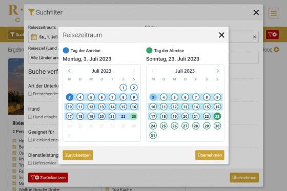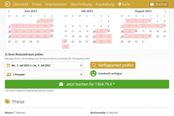 Dies betrifft sowohl die detaillierte Suchfunktion, als auch die Darstellung der Dreimonats-Kalenderübersicht in der Detaildarstellung einer Unterkunft. Final findet auch nochmals eine lokale Verfügbarkeitsprüfung innerhalb der Detailseite statt, von der aus bei Erfolg sofort eine Buchung ausgelöst werden kann.