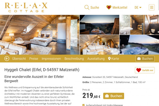 Die Buchungsplattform relax-cottage.com vermittelt exklusiv ausgestattete Feriensuiten und Ferienhäuser. Die Website präsentiert die Unterkünfte in ansprechender Form in vier Sprachen. Der Nutzer kann die Verfügbarkeit der Unterkunft im Wunschzeitraum direkt prüfen und eine Buchung über die Plattform ausführen.