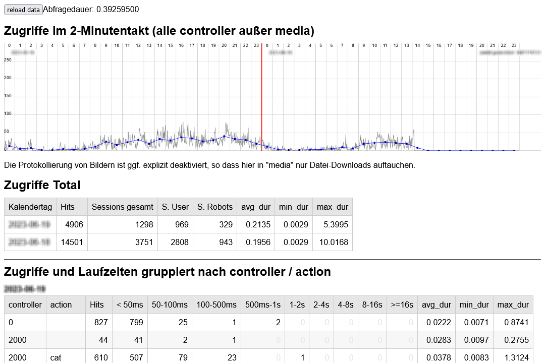 Da anfangs nicht klar war, wie stabil sich die API des Buchungsdienstleisters in punkto Geschwindigkeit verhalten würde, wurde ein eigenes Monitoring aller zeitkritischen Komponenten entwickelt. Jede Seiten- und API-Abfrage der eigenen Website wird serverseitig bis auf Ebene einzelner Controller gemessen (min, max, avg) und protokolliert und kann live als Performancediagramm abgefragt werden. Das lässt direkte Rückschlüsse auf die Leistung und Verfügbarkeit der Drittanbieter-API zu.